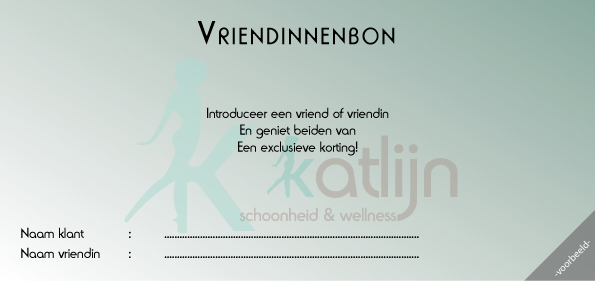 Vul uw naam in en geef de bon aan een vriend(in) die nog geen klant is van "Schoonheid en Wellness Katlijn"